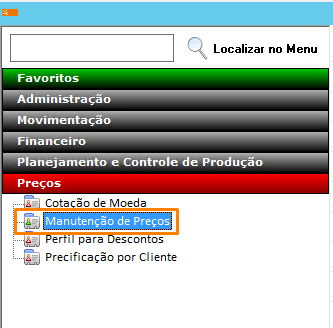 LOCAL: PREÇOS – MANUTENÇÃO DE PREÇOS
