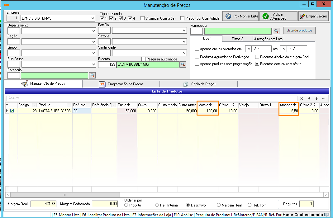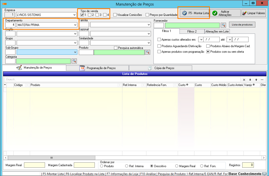 Nesta tela, verifique se os preços a serem alterados estão checados em “Tipo de Venda” e se caso necessário utilize os filtros de “departamento”, “produtos”, etc e pressione “Montar Lista (F5)”