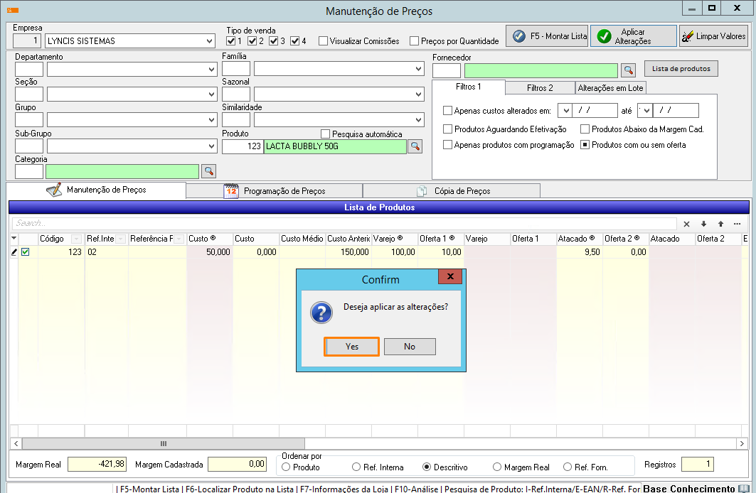 Após preenchido todos os preços necessários, pressione “Aplicar Alterações” e confirme clicando em “YES”, após isto, todos os preços alterados estarão atualizados.
