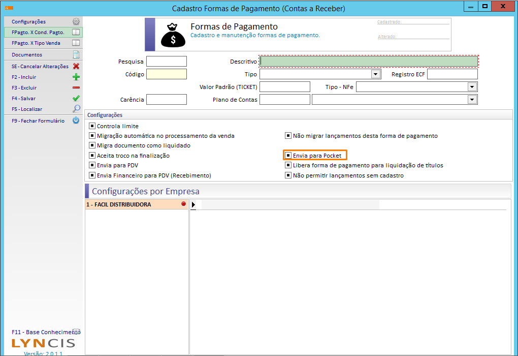 Para desativar a forma de pagamento, acesse o Lyncis ERP >> Administração >> Financeiro >> Formas de pagamento, seleciona a forma de pagamento desejada e desmarque a opção: Envia para Pocket, após desmarcar a opção e salvar, gerar carga no Pocket.