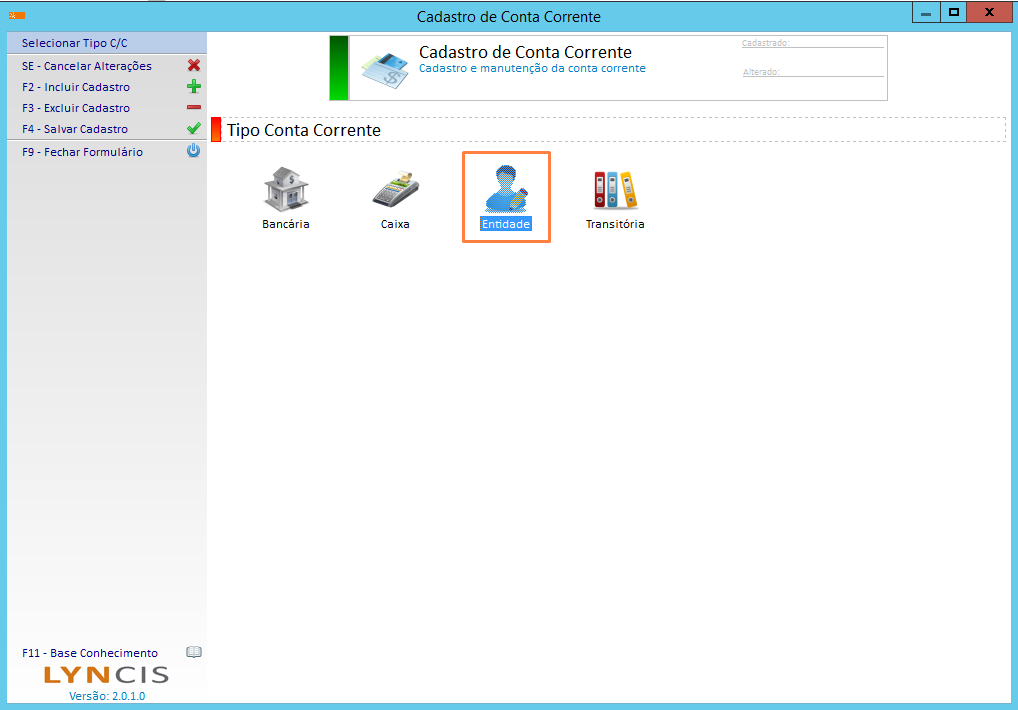 O Lyncis ERP disponibiliza vários tipos de cadastro de Contas Correntes para melhor controle de fluxo de caixa da empresa. Dentre os tipos de Contas Correntes temos o tipo Entidade e este manual é para mostrar como criar uma conta deste tipo.