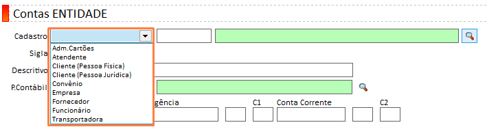 Os tipos de Cadastro que podem ser utilizados são os listados abaixo: