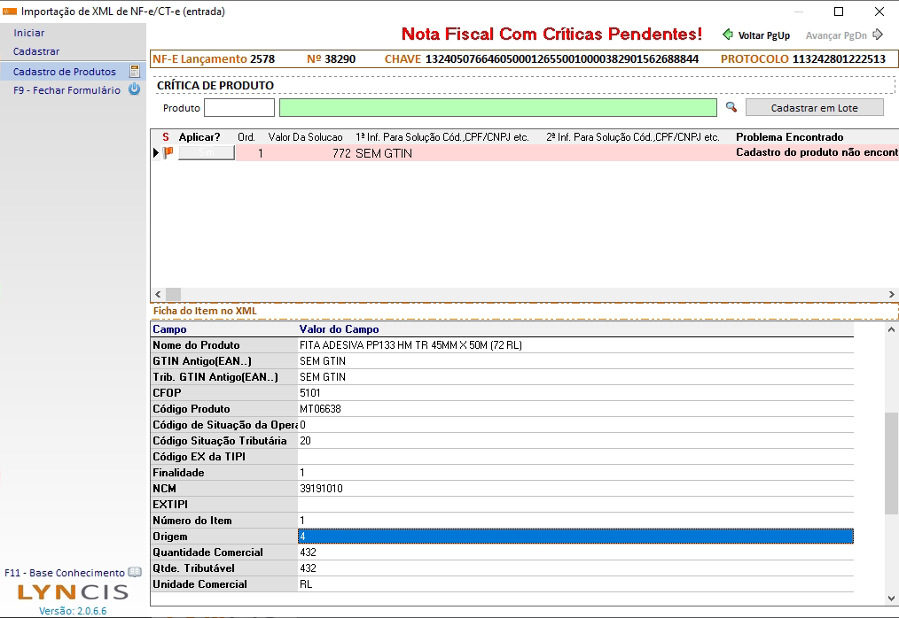 Essa informação é apresentada no quadro abaixo ao clicar na linha do item com critica, conforme abaixo. No caso do exemplo, a origem do produto veio como “4”, então na Regra de Tributação deverá ter a mesma configuração.