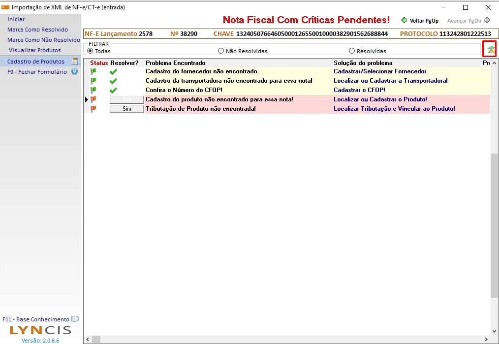 Todas essas informações podem ser verificadas diretamente da tela da importação clicando no ícone de bandeirinha verde com um alerta amarelo. Esse ícone abre a tela de “Conferência de Regras de Tributação”, nela é demonstrada todas as informações básicas que sua Regra precisa ter para que puxe/vincule a seu produto.