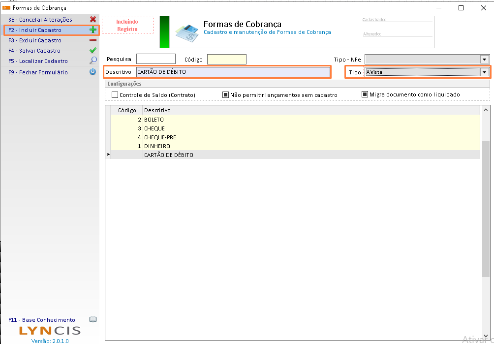 O cadastro de forma de cobrança tem como finalidade a ser informada como o prestador de serviço ou fornecedor esta lhe cobrando. Esse cadastro será exibido na finalização do recebimento de mercadoria como no contas a pagar por exemplo.
