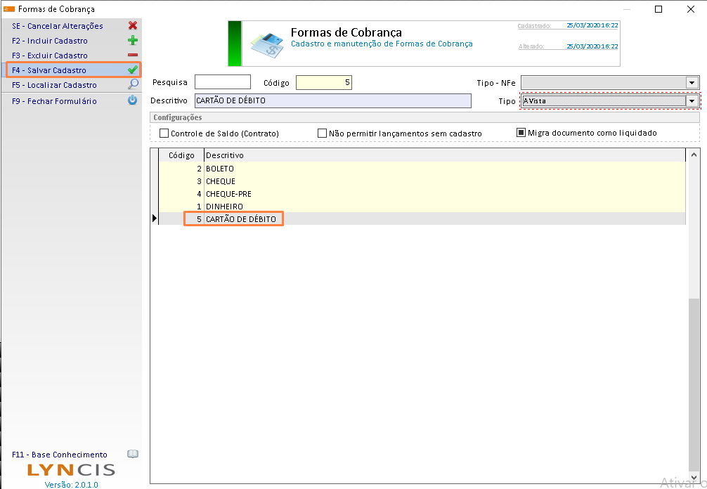 Após clique em F4 – salvar cadastro