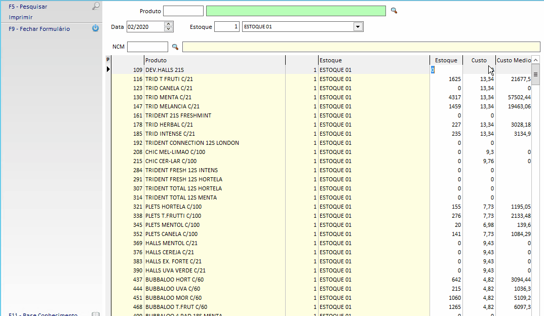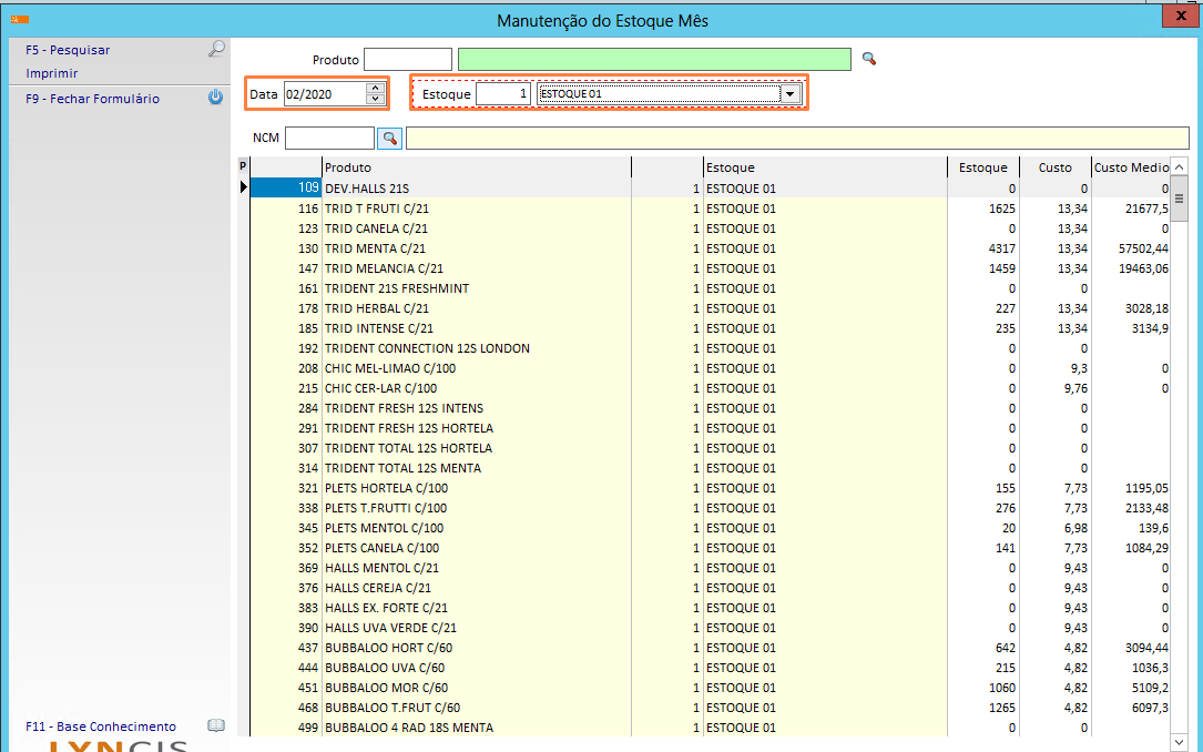 Menu do sistema → Estoque → Manutenção do Estoque Mês