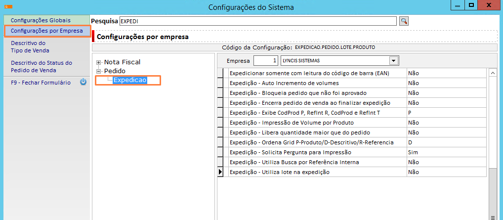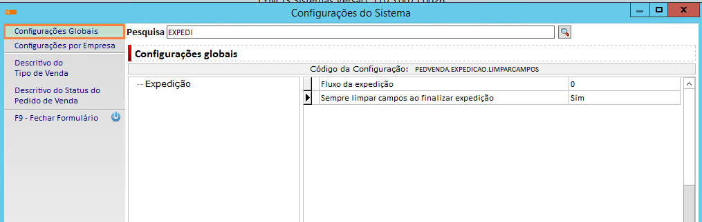 Para utilizar o modulo de expedição é necessário primeiramente realizar algumas configurações no sistema em: sistema >> configuração, filtre pela palavra Expedição e será apresentado os configs.