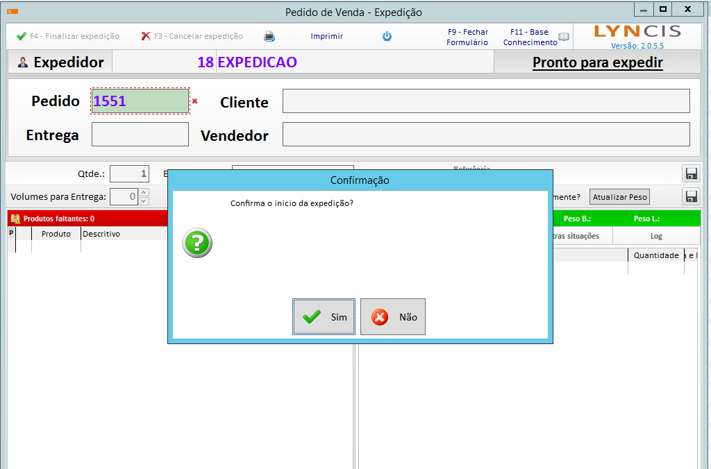 Ao acessar a tela de Pedido de venda – Expedição, será solicitado o expedidor e senha que foi criado (lembrando que é o usuário e senha criado em: administração >> usuários >> usuários):