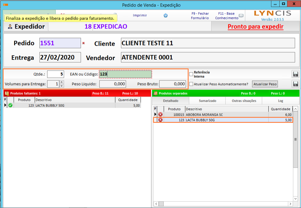 Após iniciar a expedição, existem 2 formas de inserir a quantidade nos produtos:
